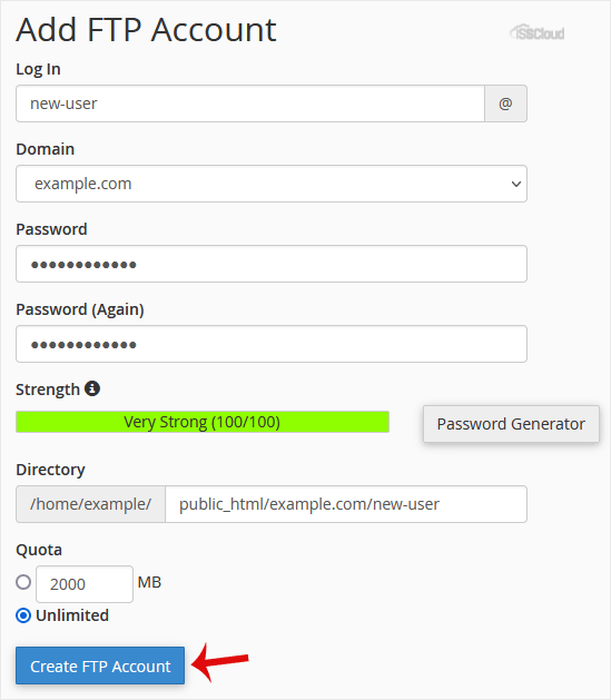 public_htmlor change the directory path to a sub-directory such aspublic_html/new-user. An FTP user doesn't have access outside the specified directory. - Quota: Specify the quota in numerical words or choose unlimited.